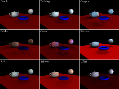 By using the different HDRI light probe images from Paul Debevec's site, you can obtain interesting results such as the following ones: